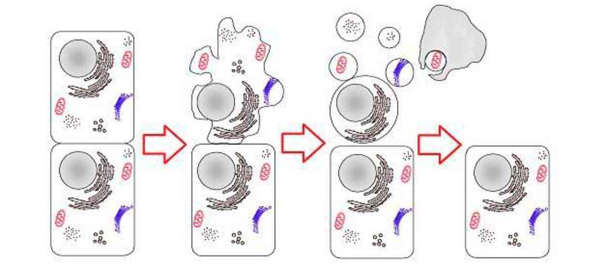 В результате клетка подвергается уменьшению размера, поскольку ее клеточные компоненты и органеллы разрушаются и конденсируются. На поверхности клеточной мембраны появляются пузырьки, повышающие ее проницаемость. Затем клетка разделяется на более мелкие фрагменты, называемые апоптозными телами. Эти фрагменты заключены в мембраны, чтобы не повредить соседние клетки.