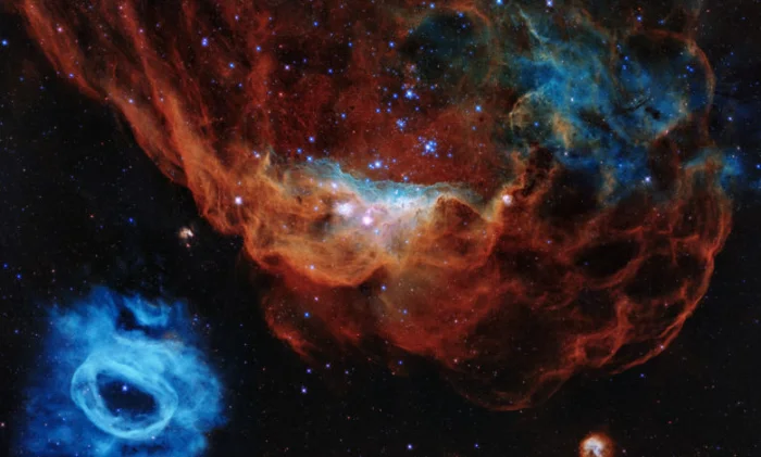 На изображении в видимом свете детализированы две туманности — ярко-синий NGC 2020, который расположен слева от изображения, и более крупный NGC 2014, который доминирует над остальной частью. Эта драматическая сцена развернулась на расстоянии около 163 000 световых лет от Земли в Большом Магеллановом Облаке — спутниковой галактике, которая вращается вокруг Млечного Пути. Яркие голубые звезды, которые украшают изображение, имеют массу, в 10 раз превышающую массу нашего Солнца. Эти левиафаны выбрасывают интенсивные потоки радиации и звездных ветров, которые отталкивают окружающий кокон газа, из которого они образовались.