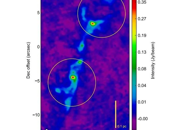 «В общем, магнитное поле, казалось, следовало направлению нити накала, и оно было перпендикулярно направлению оттоков, испускаемых некоторыми массивными протозвездными ядрами, такими как MM8a, MM7 и MM6. Ядра, которые представляли поляризацию, оказались менее фрагментированными чем те, которые не показывают поляризованное излучение. В масштабах менее 0,1 пк, магнитное поле показало аккуратную и упорядоченную картину векторов поляризации «, говорится в статье.