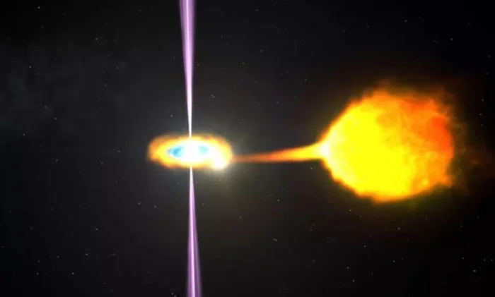 Бинарная «черная вдова» — это система, включающая пульсар (тип быстро вращающейся нейтронной звезды, которая испускает сильное электромагнитное излучение на своих полюсах) и звезду-компаньона. В этом космическом флирте нет ничего очень романтичного. У пульсара в этой паре есть только одна навязчивая идея: украсть материю у своей второй половины. По мере накопления этой материи на поверхности пульсара высвобождается поток рентгеновского и гамма-излучения, который еще больше разрушает бедную звезду. Как видите, термин «черная вдова» особенно уместен.