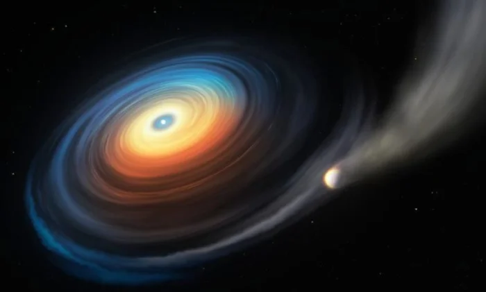 Объединив данные наблюдений с теоретическими моделями, группа астрономов из Великобритании, Чили и Германии смогла составить более четкую картину этой уникальной системы. Белый карлик маленький и очень горячий при 28 000 градусов по Цельсию. Напротив, планета ледяная и большая — по крайней мере, в два раза больше звезды. Когда он кружит вокруг горячего белого карлика с близкого расстояния и облетает его всего за десять дней, высокоэнергетические фотоны звезды постепенно сдувают атмосферу планеты. Большая часть газа уходит, но часть втягивается в диск, который втекает в звезду со скоростью 3000 тонн в секунду. Именно этот диск делает видимой скрытую, подобную Нептуну планету.