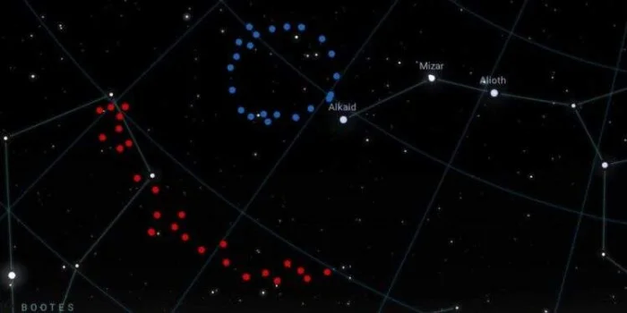 Изображение того, как выглядели бы на небе Великое кольцо (синим) и Гигантская дуга (красным).[/caption]