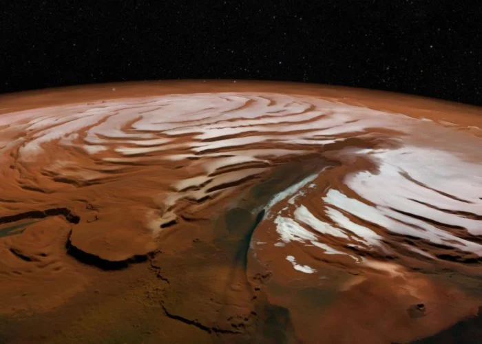 С помощью проникающего в землю радара ученые обнаружили массивный резервуар замерзшей воды, уложенный слоями песка под северной полярной ледяной шапкой на Марсе. Этот резервуар содержит так много льда, что, если его растаять и вывести на поверхность, он погрузит всю планету в воду.