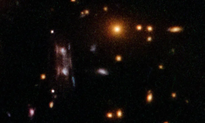 После долгих лет сомнений исследователи подтвердили природу трех странных объектов, ранее сфотографированных «Хабблом». Считается, что они являются зеркальными изображениями одной и той же галактики, удаленной на 11 миллиардов световых лет, свет которой отклоняется и умножается благодаря явлению гравитационного линзирования. Точное выравнивание между источником и скоплением, ответственным за линзирование, создает редкий и необычный эффект.