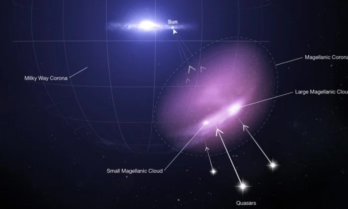 Этот диффузный ореол горячего газа, окружающий Малое и Большое Магеллановы облака, впервые и полностью нанесенный на карту, простирается более чем на 100 000 световых лет от основной массы звезд, газа и пыли, составляющих Магеллановы облака, смешиваясь с более горячей и обширной короной, окружающей Млечный Путь.