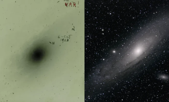 Эта пластина, видимая на изображении ниже, известна тем, что привела к открытию первой переменной звезды цефеиды в Андромеде. На пластинке стертая буква N, обозначающая «Новую» или неизвестную звезду, была отмечена Хабблом надписью «VAR!», демонстрируя, что астроном обнаружил, что ее яркость меняется, как у цефеиды.