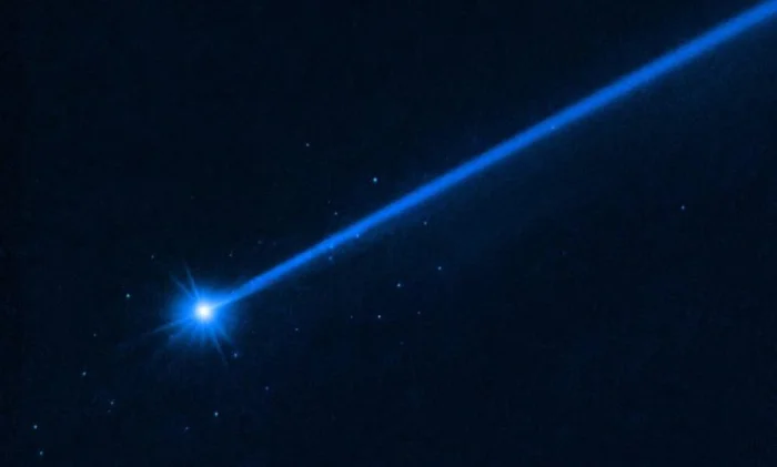 Астероид Диморфос, хвост из голубой пыли и рой из 37 крупных валунов, выброшенных после столкновения с зондом DART в сентябре 2022 г., наблюдение с помощью космического телескопа Хаббл.[/caption]