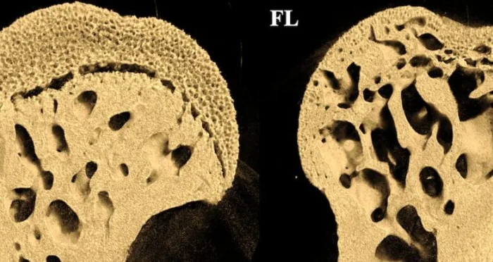 Ученые обнаружили, что после 37 дней пребывания в космосе бедренные кости подопытных мышей приобрели пористую структуру, напоминающую швейцарский сыр. Наиболее выраженные изменения наблюдались в области суставов, тогда как поясничные позвонки, не испытывающие значительной нагрузки у грызунов, остались практически неповрежденными. Эти данные особенно тревожны для человека, чей позвоночник постоянно подвергается нагрузке в условиях земной гравитации.