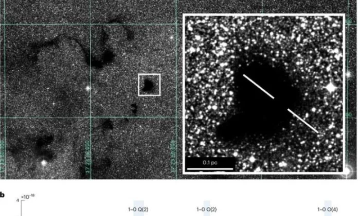 Объектом изучения выступило облако Барнард 68, расположенное на расстоянии около 500 световых лет от Земли в созвездии Змееносца. Температура в его недрах составляет −264 °C, а плотность настолько велика, что свет почти не проникает внутрь. В этих условиях ключевую роль играют космические лучи — высокоэнергетические заряженные частицы из глубокого космоса. Они ионизируют газ, регулируют химию и температуру, делая возможным формирование сложных молекул.