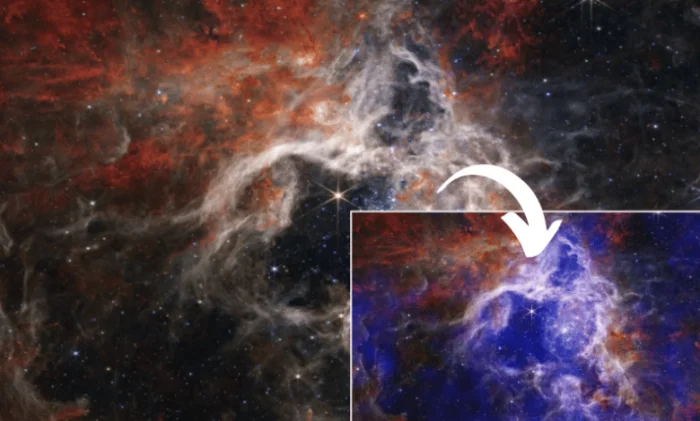 В сентябре 2022 года телескоп Джеймса Уэбба (JWT) предложил беспрецедентный взгляд (см. ниже) на туманность Тарантул. В то время обсерватория представила картину туманности шириной 350 световых лет, то есть это расстояние настолько велико, что свету требуется более трех столетий, чтобы пройти от одного края до другого.
