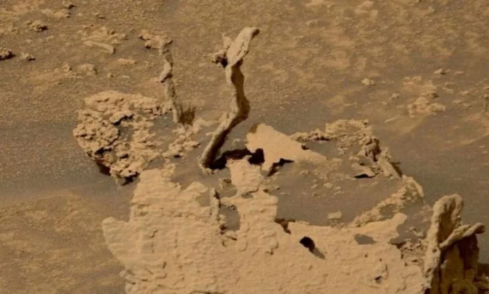 Марсоход Curiosity находится в кратере Гейла на Марсе с 2012 года, неустанно исследуя его и иногда присылая странные фотографии, которые могут напоминать о менее засушливом прошлом планеты. 7 мая мир был заинтригован образованием «двери». А теперь это два хрупких образования, не поддающихся гравитации. Они выглядят почти как струи замерзшей воды, льющиеся из невидимого с неба кувшина. Считается, что они представляют собой цементоподобные вещества, которые когда-то заполняли древние трещины в горных породах, которые с тех пор подверглись эрозии.