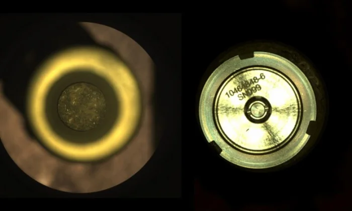 Слева: открытый титановый контейнер с первым образцом марсианской породы и пыли внутри. Справа — запечатанный контейнер. Фотография была сделана камерой CacheCam.[/caption]