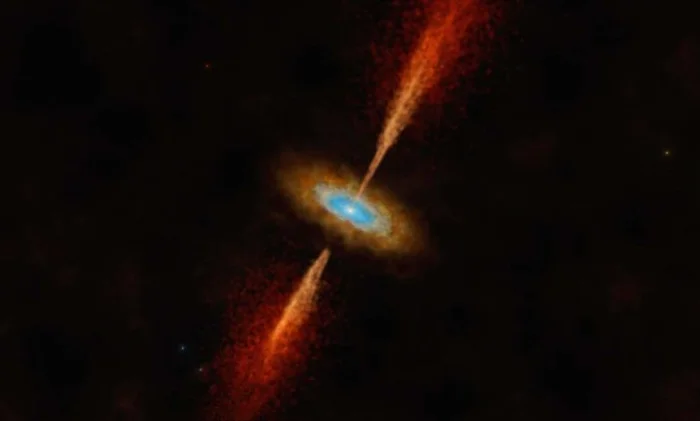 Художественное изображение системы HH 1177 в Большом Магеллановом Облаке, где ALMA наблюдал диск вокруг молодой массивной звезды.[/caption]