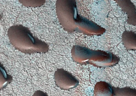 Марсианский орбитальный аппарат НАСА Mars Reconnaissance Orbiter (MRO) обнаружил в северном полушарии Марса странные дюны, напоминающие гигантские красные бобы. Предполагается, что они застыли в таком виде до марсианской весны благодаря покрывающему их…
