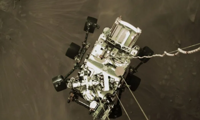 NASA выпустило первые изображения с высоким разрешением, отправленные обратно марсоходом Perseverance, включая драматическую картину приземления на Марс, сделанную посадочным аппаратом Sky Crane. Снимок был сделан в виде кадра с видеозаписи приземления, который до сих пор принимается и обрабатывается.