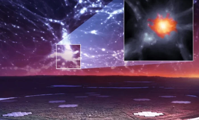 Художественное изображение крупномасштабной структуры Вселенной над телескопом LOFAR. На вставке показано увеличение галактического скопления, в котором наблюдается мегагало (эмиссия оранжевого цвета).[/caption]