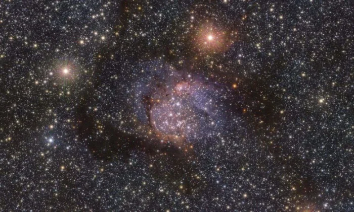 Изображение туманности Sh2-54, полученное в инфракрасном свете с помощью телескопа VISTA ESO в Паранальской обсерватории в Чили. Облака пыли и газа, которые обычно видны в видимом свете, кажутся почти прозрачными. В этой полосе света мы можем видеть звезды сквозь пыль и газ туманности.[/caption]