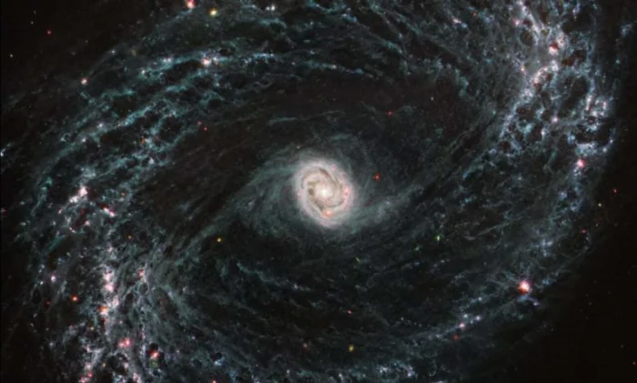 Области, которые обычно кажутся темными в видимом свете, становятся ярче под инфракрасным глазом Уэбба, в то время как окружающие скопления пыли и газа поглощают свет от формирующихся звезд и излучают его обратно в инфракрасном диапазоне. В центре галактики сияет ядро, характеризующееся структурой двойного кольца, определяемого спиральными рукавами, которые плотно сворачиваются в овал.