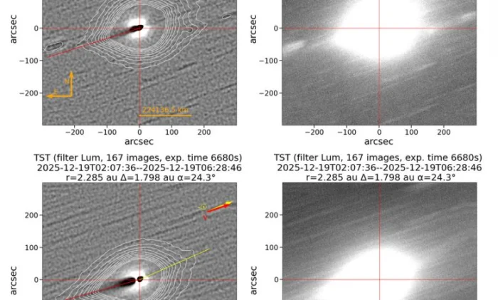 Астрономы, ведущие наблюдения за межзвёздной кометой 3I/ATLAS (C/2025 N1), подтвердили обнаружение необычного хвоста, направленного в сторону Солнца. Наблюдения велись с 29 ноября 2025 года с помощью двухметрового телескопа TTT и обзорного телескопа TST, расположенных в обсерватории дель Тейде на Тенерифе. На глубоких снимках, полученных 19 декабря в момент перигея, этот особенность выглядит как узкое удлинение, простирающееся от центрального сгустка комы в сторону Солнца, с проекционной длиной около 450 000 километров.