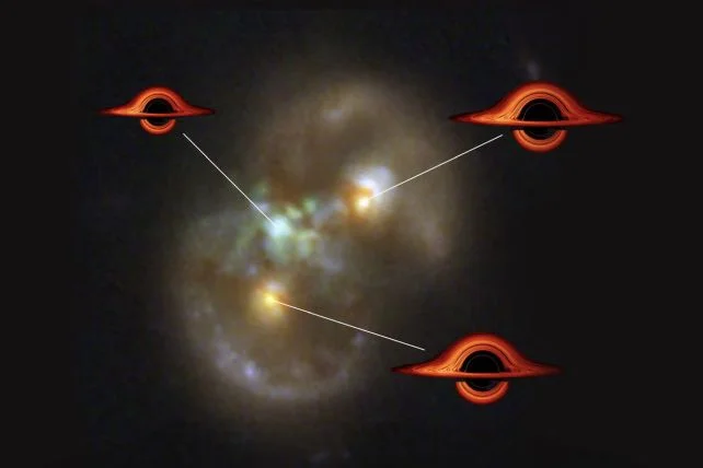 Галактика, получившая название Infinity, состоит из двух долей, каждая из которых содержит яркое ядро со сверхмассивной черной дырой. Но в месте их пересечения ученые обнаружили третью светящуюся область. Анализ в разных диапазонах показал, что это еще одна черная дыра, расположенная между двумя основными.
