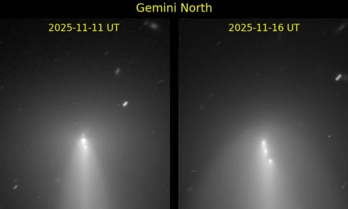 Комету C/2025 K1 (ATLAS), открытую в 2025 году, продолжает разрывать на части. Новые снимки, полученные на телескопе «Джемини-Север» в обсерватории Мауна-Кеа, зафиксировали, как ядро небесной странницы распадается на множество фрагментов, демонстрируя быстро меняющуюся структуру.