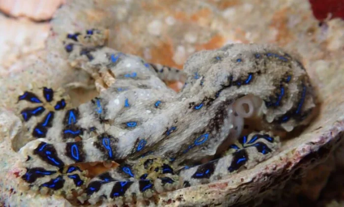 Этот небольшой ядовитый головоногий моллюск обитает в прибрежных водах Тихого и Индийского океанов, в частности в Австралии, Индонезии, на Филиппинах и в Японии. Его необычная внешность — электрические синие кольца, которые загораются в случае опасности, — является недвусмысленным предупреждением для хищников. Его яд — мощный нейротоксин, называемый тетродотоксином, — способен вызвать смертельный паралич как у добычи, так и у человека.