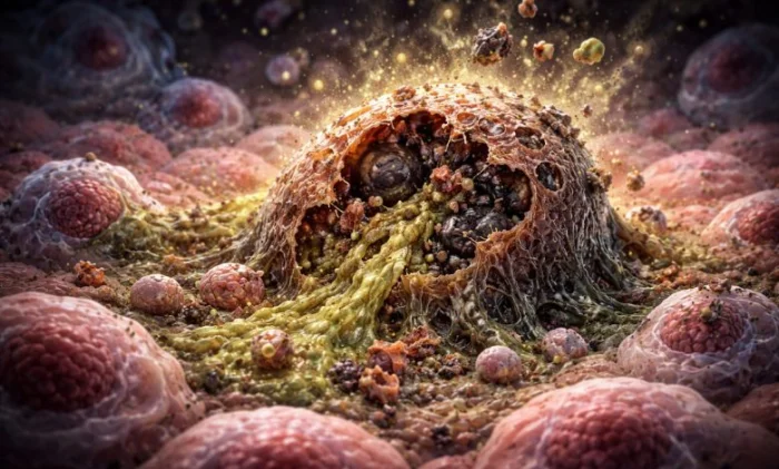 Некроз это неконтролируемая, патологическая смерть клетки в живом организме из-за экстремальных факторов (отсутствие кислорода, токсины, травма, холод, патогены). Внутри клетки отключаются «энергостанции» (митохондрии), прекращается синтез АТФ — универсального топлива. Это ведет к коллапсу клеточных насосов, поддерживающих баланс ионов. Клетка набухает, мембраны рвутся, и ее внутреннее содержимое (белки, ДНК, органеллы) изливается наружу.