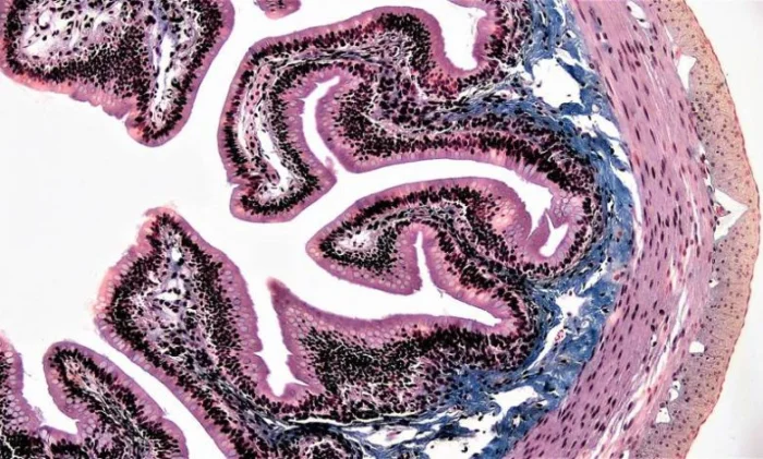 Простой столбчатый эпителий кишечника. 10-кратное увеличение.[/caption]