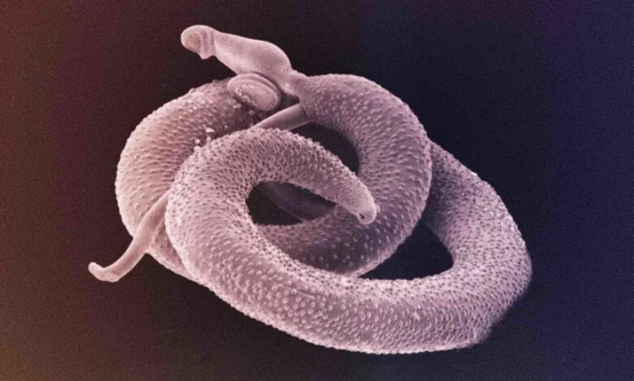 Schistosoma mansoni — плоский червь, который ежегодно заражает более 250 миллионов человек, преимущественно в Африке, Южной Америке и на Ближнем Востоке. Инфицирование начинается, когда личинки паразита, называемые церкариями, проникают через кожу при контакте с зараженной пресной водой.
