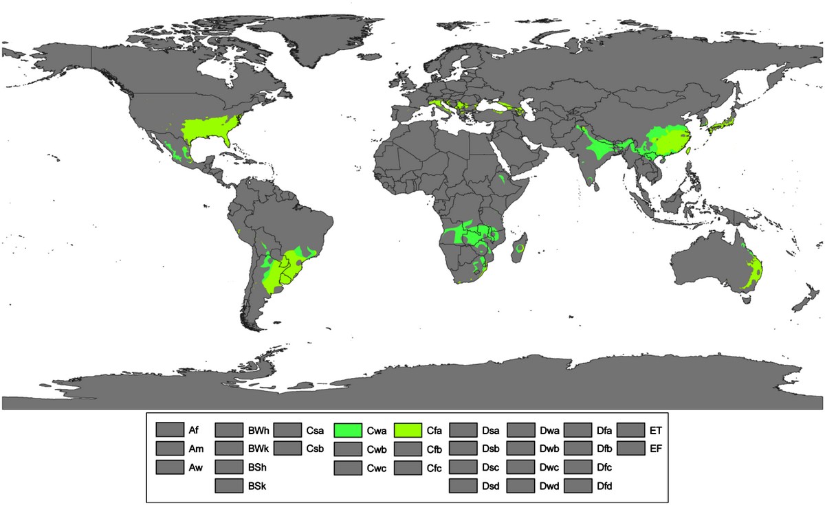 Влажный субтропический климат характеризуется жарким влажным летом и относительно прохладной зимой. Он в основном распространен на восточных окраинах всех континентов, а также между 25 и 35 градусами южной и северной широты в непосредственной близости от тропического климата.