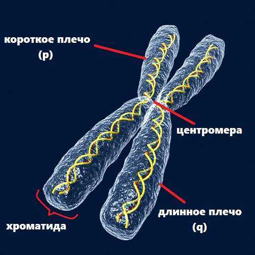 Недублированные хромосомы являются одноцепочечными и состоят из области центромера, которая соединяет плечи хромосомы. Короткое плече обозначают буквой p, а длинное буквой q. Конечные области хромосом называются теломерами, которые состоят из повторяющихся некодирующих последовательностей ДНК, укорачивающихся во время деления клетки.