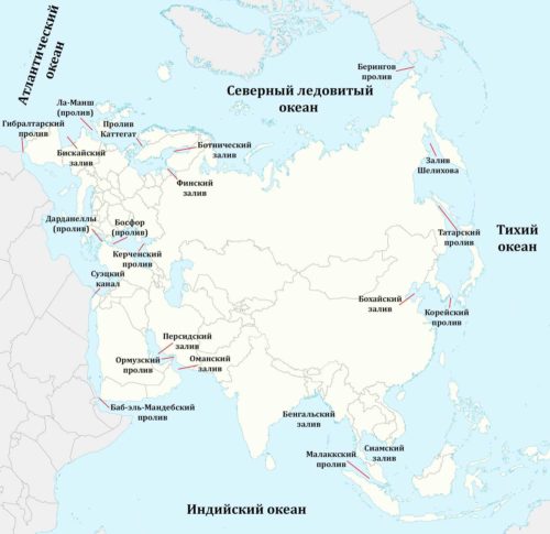 Какие проливы и заливы омывают материк Евразия — список, описание и карта