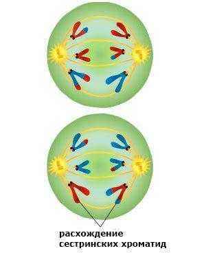 - Сестринские хроматиды разделяются и начинают перемещаться к противоположным концам (полюсам) клетки. Волокна веретена деления, не связанные с хроматидами, вытягиваются и удлиняют клетки.