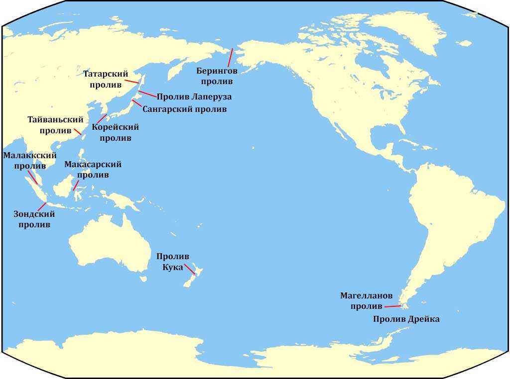 Самые большие проливы Тихого океана - список, характеристика и карта