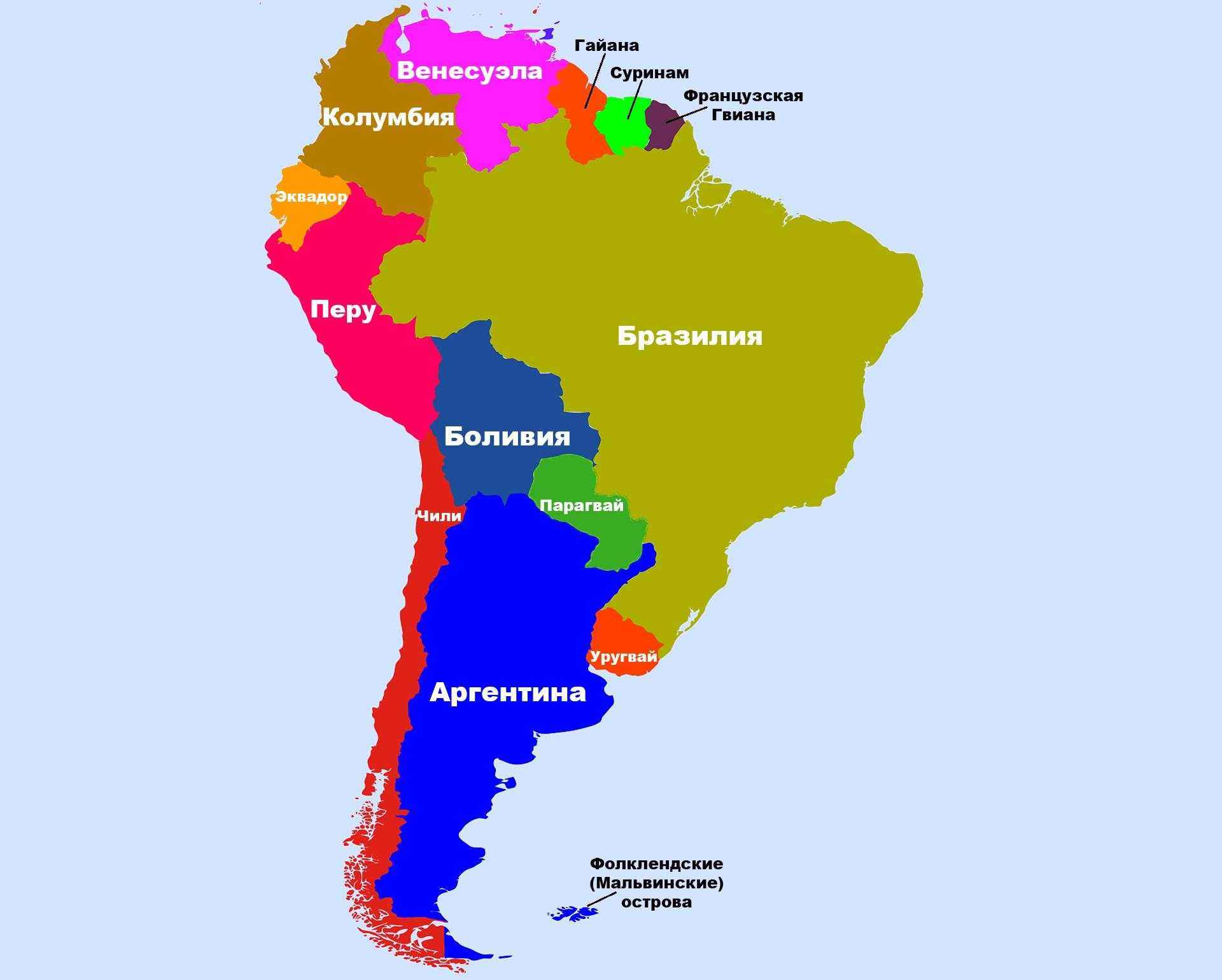 Политическая карта Южной Америки с названиями стран на русском языке