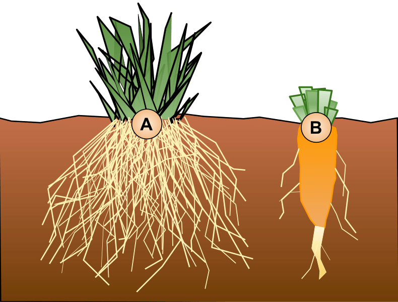 Два типа корневой системы растений: (A) — Мочковатая корневая система и (В) — стержневая корневая система. Изображение: KaitlinLiu / Wikimedia Commons