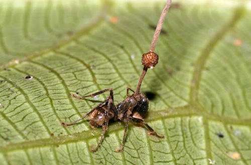 Гриб заставляет муравья искать прохладное влажное место и прикусывать нижнюю часть листа. Эта среда идеально подходит для размножения гриба. Как только муравей прикусывает лист, он больше не может его отпустить, так как гриб блокирует мышцы муравья. Грибковая инфекция убивает муравья, а гриб растет из его голов. Растущая грибковая строма имеет воспроизводящие структуры, которые продуцируют споры. Как только грибковые споры высвобождаются, они распространяются и подхватываются другими муравьями.