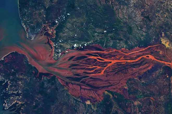 На снимке река кажется кроваво-красной, напоминая артерии или сосуды в сетчатке глаза. Этот яркий оттенок обусловлен высоким содержанием железистых осадков, которые река переносит к побережью. Осадки накапливаются из-за интенсивной эрозии почвы, вызванной массовой вырубкой лесов в регионе. В течение последнего столетия, согласно данным NASA, леса Мадагаскара подверглись значительным разрушениям, что привело к уязвимости почвы перед тропическими ливнями и штормами.