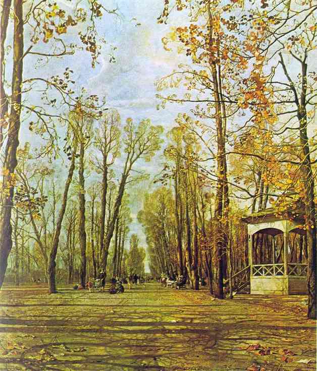Многие деревья стоят голыми, только на некоторых еще осталась пожелтелая листва. Кругом по аллее разбросаны опавшие листья, окрашенные в желтые, оранжевые, коричневые краски осени. Возраст деревьев совпадает с появление Летнего сада. Они как бы соединяются с голубым небом и облаками, которые от солнечного света тоже окрасились в желтый цвет.