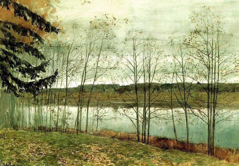 Сзади картины видна стена деревьев смешанного леса. А в середине изображена река, на которой, как в зеркале проплывают серые дождевые облака. Они хорошо сочетаются с оголенными деревьями, придавая грусть, тоску по ушедшему солнечному лету.