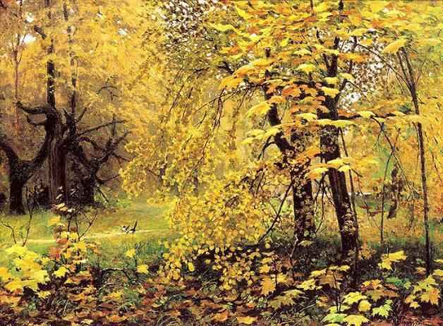 Яркость золотых листьев подчеркивают черные стволы деревьев. Многие из них причудливо переплетаются, и становятся похожими на сказочных существ. Небо лишь местами просвечивает сквозь ветви деревьев, но оно светлое без облаков. Вероятней всего изображен солнечный и ясный день.