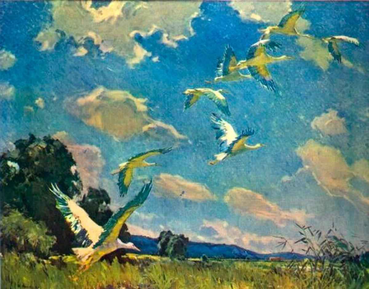 Глядя на пейзаж восхищаешься увиденным, и художником, так чутко чувствующим природу родного края. Не каждый мастер смог бы показать взлет птиц так правдоподобно. В этом раскрывается талант живописца. Картиной «Аисты» будет восхищаться еще не одно поколение.