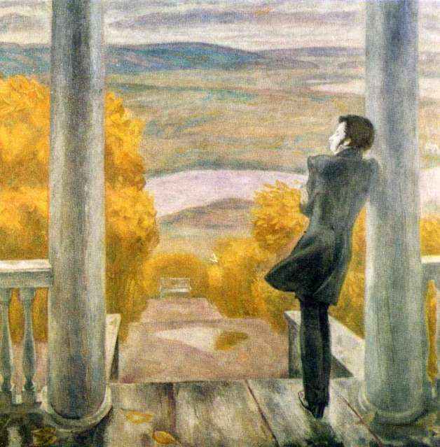 Картина была бы холодной и грустной, если бы не одетые в золото деревья. Они словно солнце придают яркость и свет всему произведению. Скорее всего деревья совсем недавно переоделись в прекрасные золотистые наряды, и лишь отдельные листочки начинает повсюду разносить ветер. Некоторые из них оказались на крыльце, где стоит поэт.