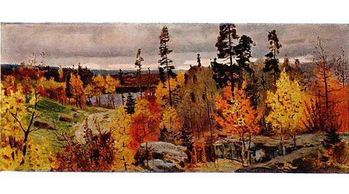 Тема золотой осени волновала многих живописцев, каждый старался изобразить этот период изменений природы по-своему. Русский художник двадцатого века – Василий Мешков, написал панорамную картину: «Золотая осень в Карелии». В ней хорошо переданы контрасты осенних красок. Если бы не разноцветье листвы, то осенняя картина смотрелась бы довольно печально.