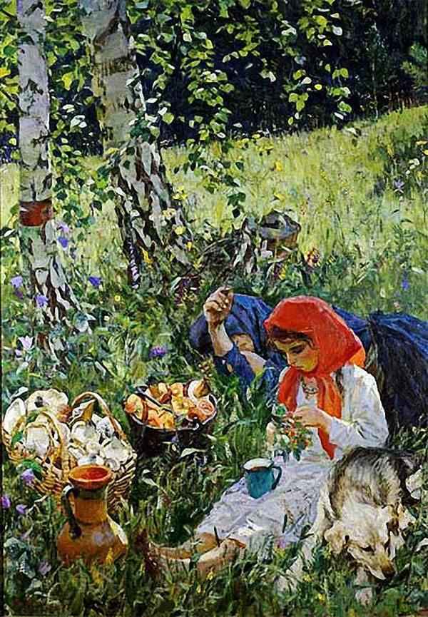 На переднем плане картины изображены мать и дочь, а так же верный друг человека – собака. Возле них находятся полная корзина с белыми и ведерко с рыжими грибами. Чтобы собрать столько грибов им нужно было встать рано, пока не начался летний зной и гулять по лесу несколько часов.