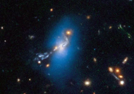 Изображение скопления галактик SPT-CL J2106-5844, полученное Хабблом. Синий цвет представляет собой явление «призрачного света» между галактиками, рассеянного звездами-сиротами.[/caption] Новое инфракрасное исследование, проведенное…
