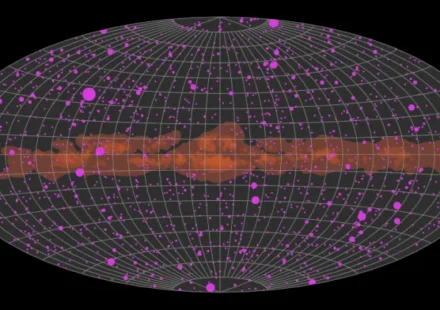 Посмотрите на космический фейерверк гамма-излучения в этой анимации, используя данные, полученные всего за год с помощью Large Area Telescope (LAT) на борту космического гамма-телескопа Ферми NASA. Пурпурный круг каждого объекта увеличивается по мере…