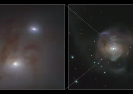 Изображение, показывающее слева более близкий вид (сделанный с помощью MUSE VLT) и справа более широкий вид (сделанный с помощью обзорного телескопа VLT) двух очень ярких галактических ядер, каждое из которых содержит сверхмассивную черную дыру, в…