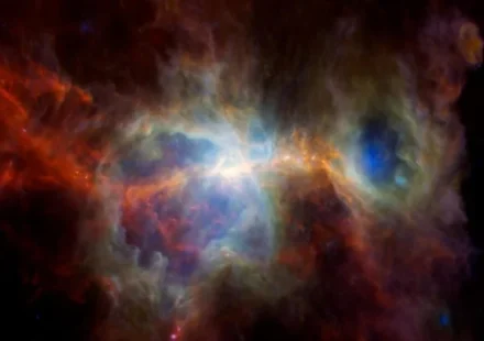 Инфракрасное изображение туманности Орион, видно много пыли, но нет звезд. Благодаря инфракрасному излучению можно увидеть горячие точки, где формируются новые звезды. Полости в туманности были созданы массивными, яркими звездами.[/caption] Новое…