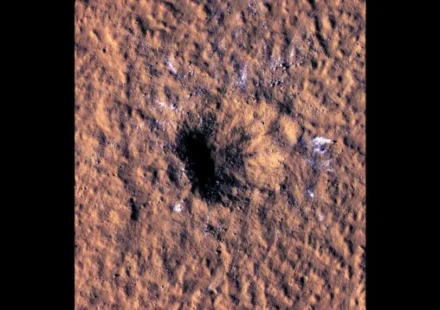 Кратер, образовавшийся в результате удара, вызвавшего землетрясение, обнаруженное Insight, окруженный глыбами льда, скрытыми под поверхностью, увековечен камерой HiRISE на борту NASA MRO.[/caption] 24 декабря 2021 года сейсмограф аппарата InSight…